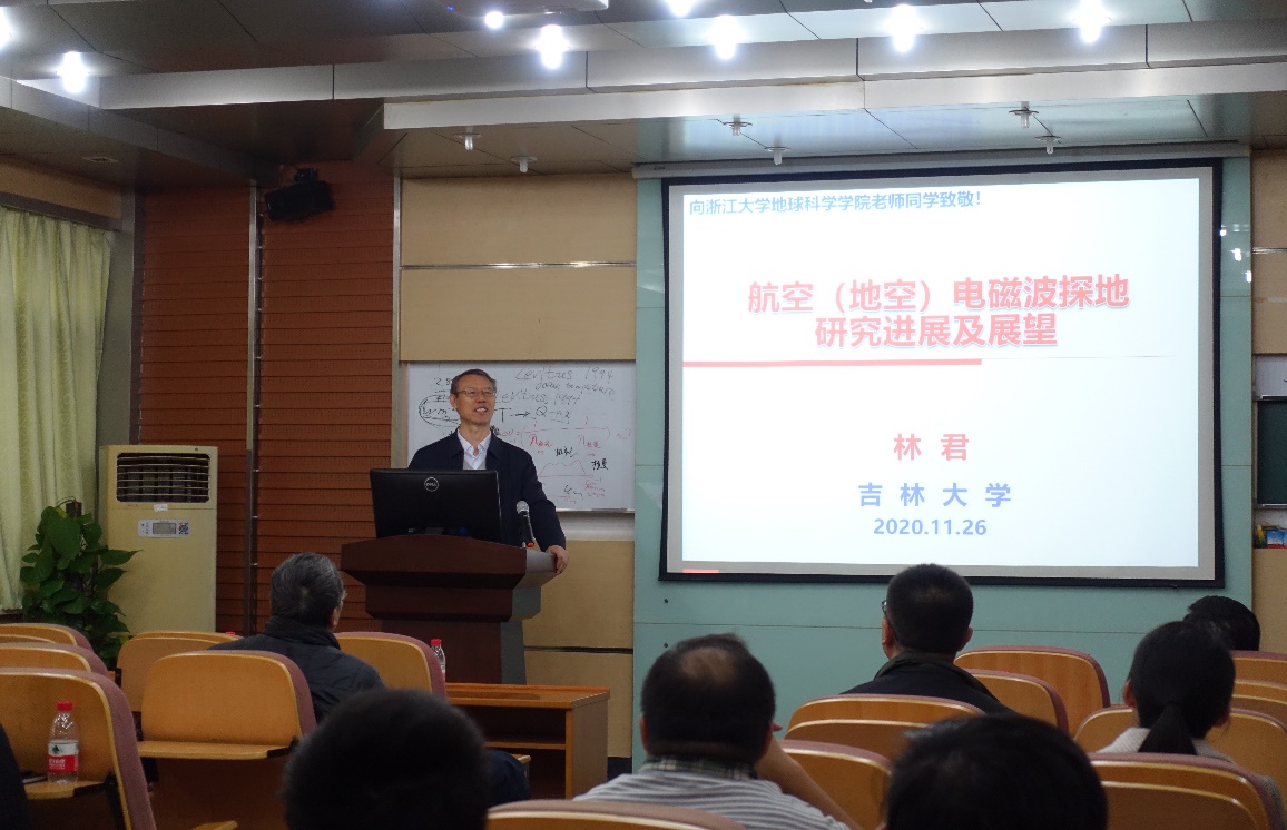 2020年11月26日下午,中国工程院院士、吉林大学教授林君院士应77779193永利官网邀请,做客77779193永利官网“理学大师论坛”,在玉泉校区第六教学大楼203会议室带来了题目为“航空(地空)电磁探测研究进展与展望”的精彩学术报告。